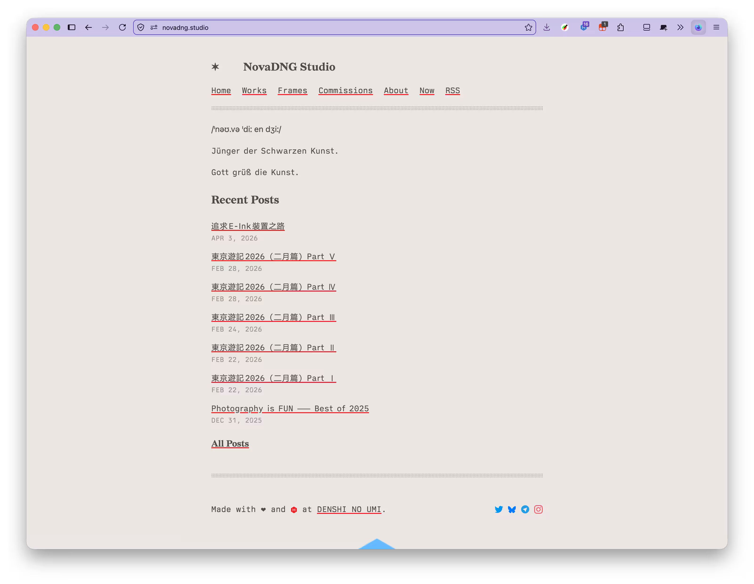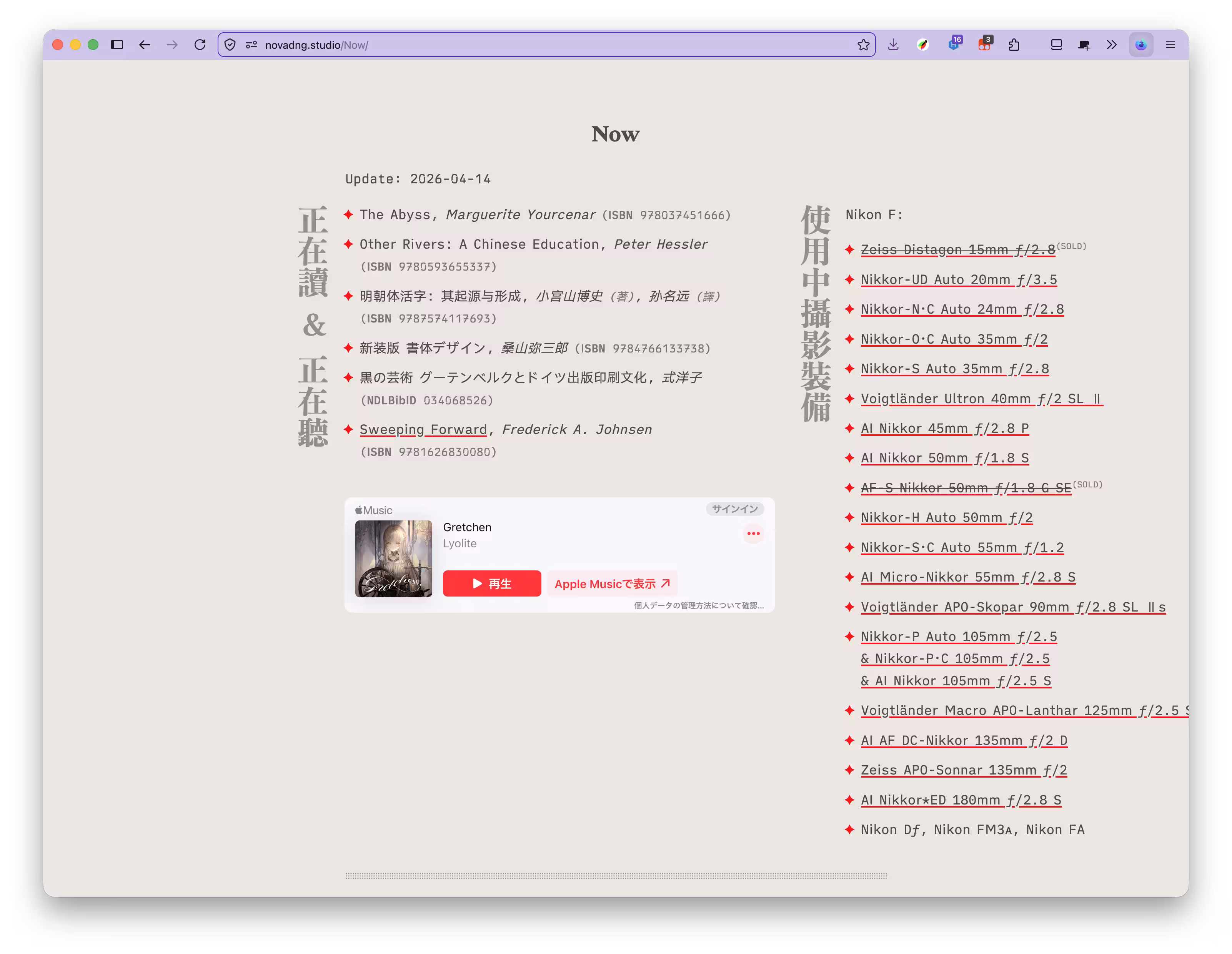 俗話說手裡有了錘子看什麼都像釘子, 我完成Archive大改造之後就將目光投向了其他頂級頁面. Works與Frames因架構較為複雜且標題幾乎全為西文而放棄; 剩餘頁面看起來似乎都很適合改成橫向分欄, 於是說時遲那時快, 一番調整後就變成了現在這幅模樣. CSS IS AWESOME.