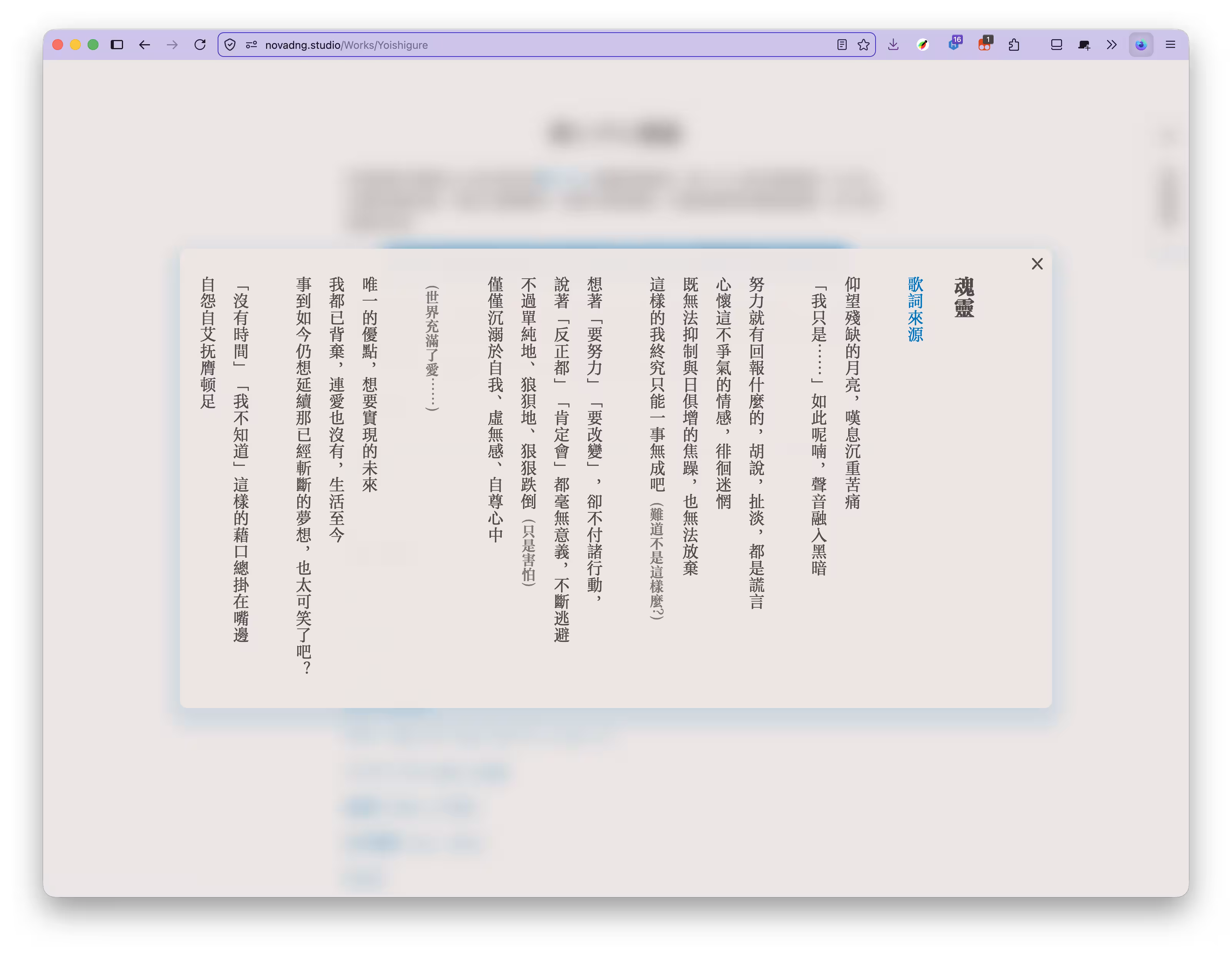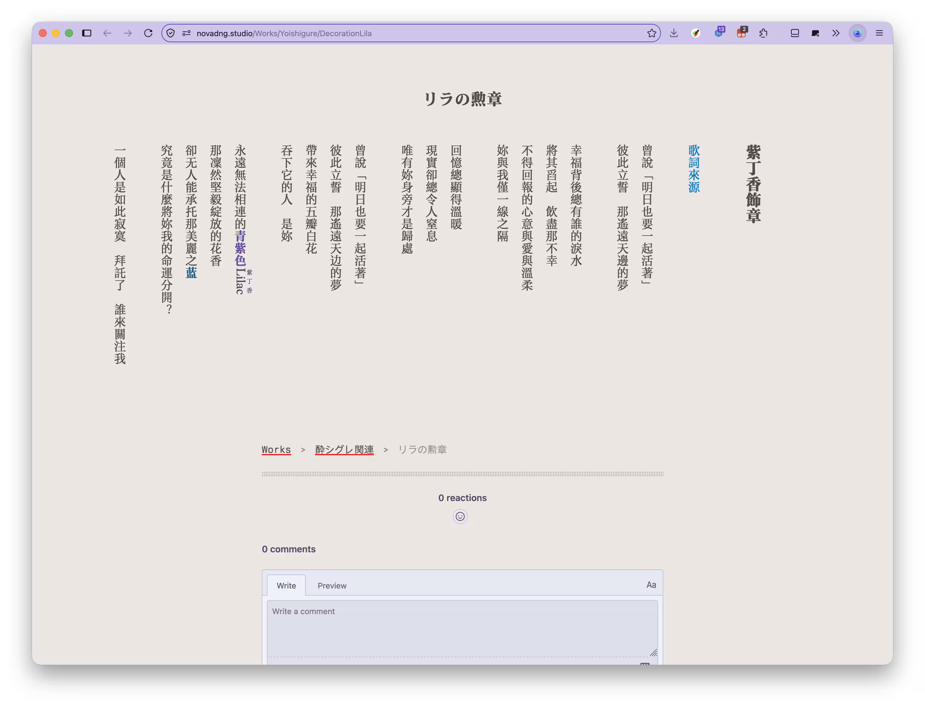 其實我在看到123哆3的主頁前就在酔シグレ歌詞頁部署了縱書. 畢竟縱書確實非常適合用來呈現歌詞. 話又說回來, 我之前翻譯的歌詞都是直接發在B站, 若不是因為去參加Fanbox Live vol. 2我大概也不會有動力做這種工程量巨大的改動吧, 感謝香音老師.